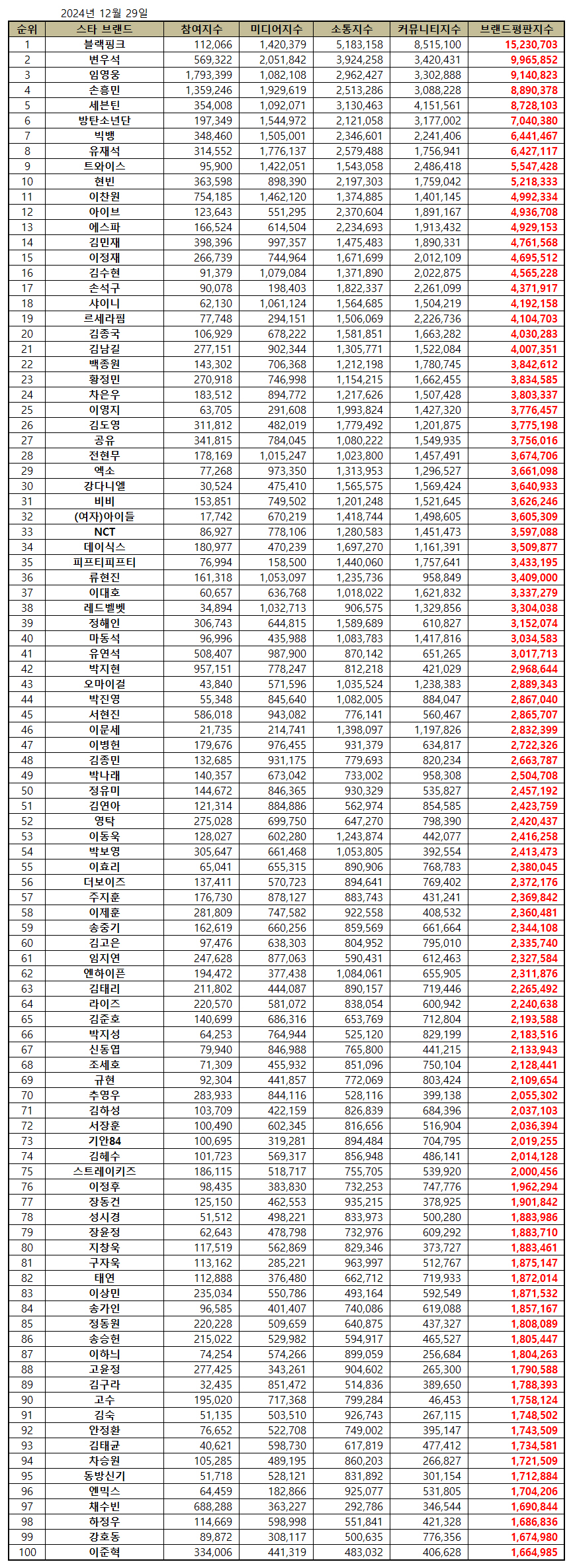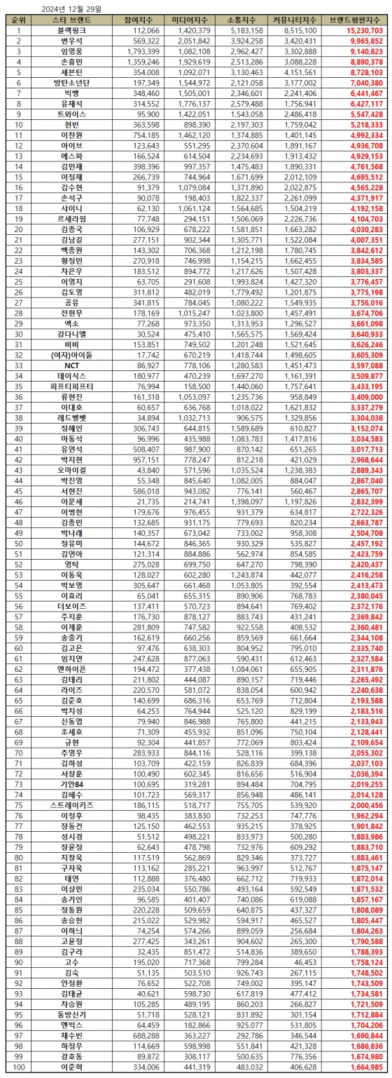 스타 브랜드평판 2024년 12월 빅데이터 분석 100위는 블랙핑크, 변우석, 임영웅, 손흥민, 세븐틴, 방탄소년단, 빅뱅, 유재석, 트와이스, 현빈, 이찬원, 아이브, 에스파, 김민재, 이정재, 김수현, 손석구, 샤이니, 르세라핌, 김종국, 김남길, 백종원, 황정민, 차은우, 이영지, 김도영, 공유, 전현무, 엑소, 강다니엘, 비비, (여자)아이들, NCT, 데이식스, 피프티피프티, 류현진, 이대호, 레드벨벳, 정해인, 마동석, 유연석, 박지현, 오마이걸, 박진영, 서현진, 이문세, 이병헌, 김종민, 박나래, 정유미, 김연아, 영탁, 이동욱, 박보영, 이효리, 더보이즈, 주지훈, 이제훈, 송중기, 김고은, 임지연, 엔하이픈, 김태리, 라이즈, 김준호, 박지성, 신동엽, 조세호, 규현, 추영우, 김하성, 서장훈, 기안84, 김혜수, 스트레이키즈, 이정후, 장동건, 성시경, 장윤정, 지창욱, 구자욱, 태연, 이상민, 송가인, 정동원, 송승헌, 이하늬, 고윤정, 김구라, 고수, 김숙, 안정환, 김태균, 차승원, 동방신기, 엔믹스, 채수빈, 하정우, 강호동, 이준혁 순으로 분석됐다.