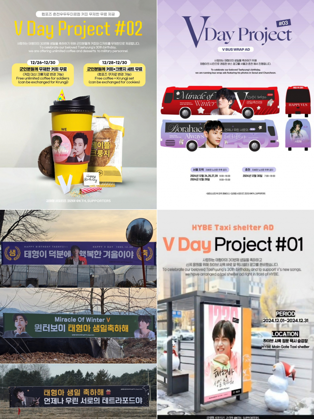 뷔가 복무중인 부대 인근에도 생일 축하메시지를 실은 현수막이 설치돼 생일축하의 열기를 더하고 있다. 뷔의 생일을 축하하고 신곡을 응원하기 위해서 소속사 하이브 사옥 앞에 위치한 택시 쉘터 광고도 진행하고 있다.