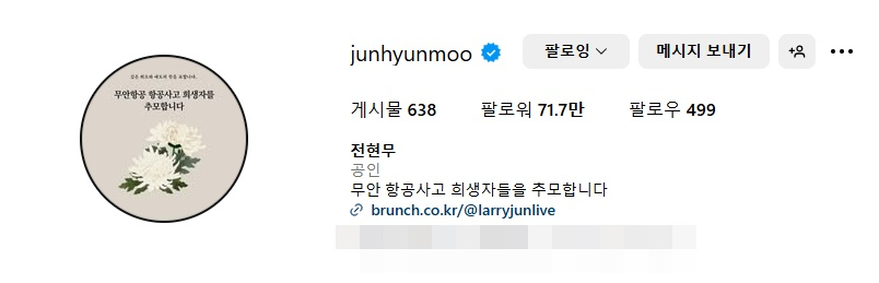 전현무는 29일 자신의 인스타그램 프로필란에 "무안 항공사고 희생자들을 추모합니다"라고 적고 프로필 사진을 국화꽃으로 교체했다.