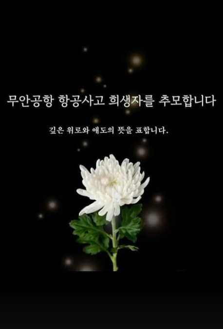 박나래도 이날 SNS에 "삼가 고인의 명복을 빕니다"라며 국화 사진을 게재했으며, 지드래곤도 흑백의 국화 그림을 올리며 추모에 동참했다. 송가인 역시 "무안공항 항공사고 희생자를 추모합니다. 깊은 위로와 애도의 뜻을 표합니다"라고 글을 올렸다.
