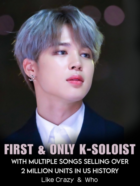 지민은 이미 지난해 발표한 첫 솔로 앨범 '페이스'(FACE)의 타이틀곡 '라이크 크레이지'(Like Crazy)가 미국에서 200만 유닛 이상 판매를 기록하며 당시 지난 10년 동안 K팝 솔로 최초이자 유일하게 더블 플래티넘 자격을 획득한 바 있다.