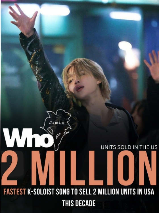 지민의 두번째 솔로 앨범 'MUSE' 타이틀곡 'Who'는 12월 27일(현지 시간) 미국에서 200만 유닛 이상 판매를 기록해 미국 레코드산업협회(이하 RIAA, Recording Industry Association of America)로부터 더블 플래티넘 인증 자격을 획득했다.
