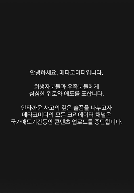 또한 메타코미디는 "안타까운 사고의 깊은 슬픔을 나누고자 메타코미디의 모든 크리에이터 채널은 국가애도기간 동안 콘텐츠 업로드를 중단한다"고 설명했다.