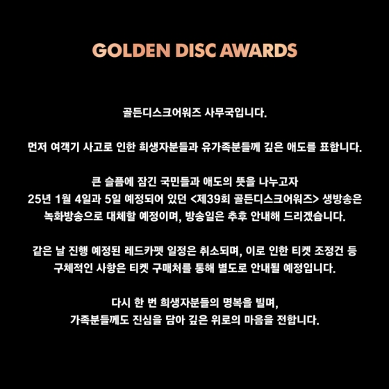 31일 골든디스크어워즈 사무국은 "먼저 여객기 사고로 인한 희생자분들과 유가족분들께 깊은 애도를 표합니다"라며 "큰 슬픔에 잠긴 국민들과 애도의 뜻을 나누고자 25년 1월 4일과 5일 예정되어 있던 '제39회 골든디스크어워즈' 생방송은 녹화방송으로 대체할 예정이며, 방송일은 추후 안내해 드리겠습니다"라고 밝혔다.