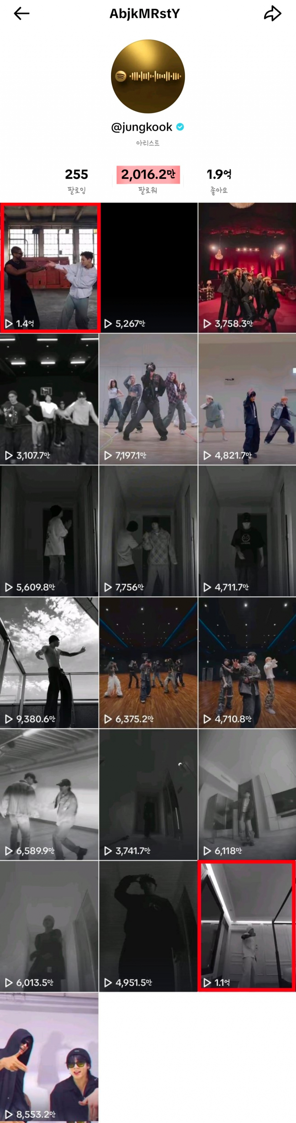 정국의 틱톡 계정의 총 19개 게시물 중 1억 이상 조회수 영상은 2개, 5000만 이상 조회수 영상은 12개를 기록하고 있다.
