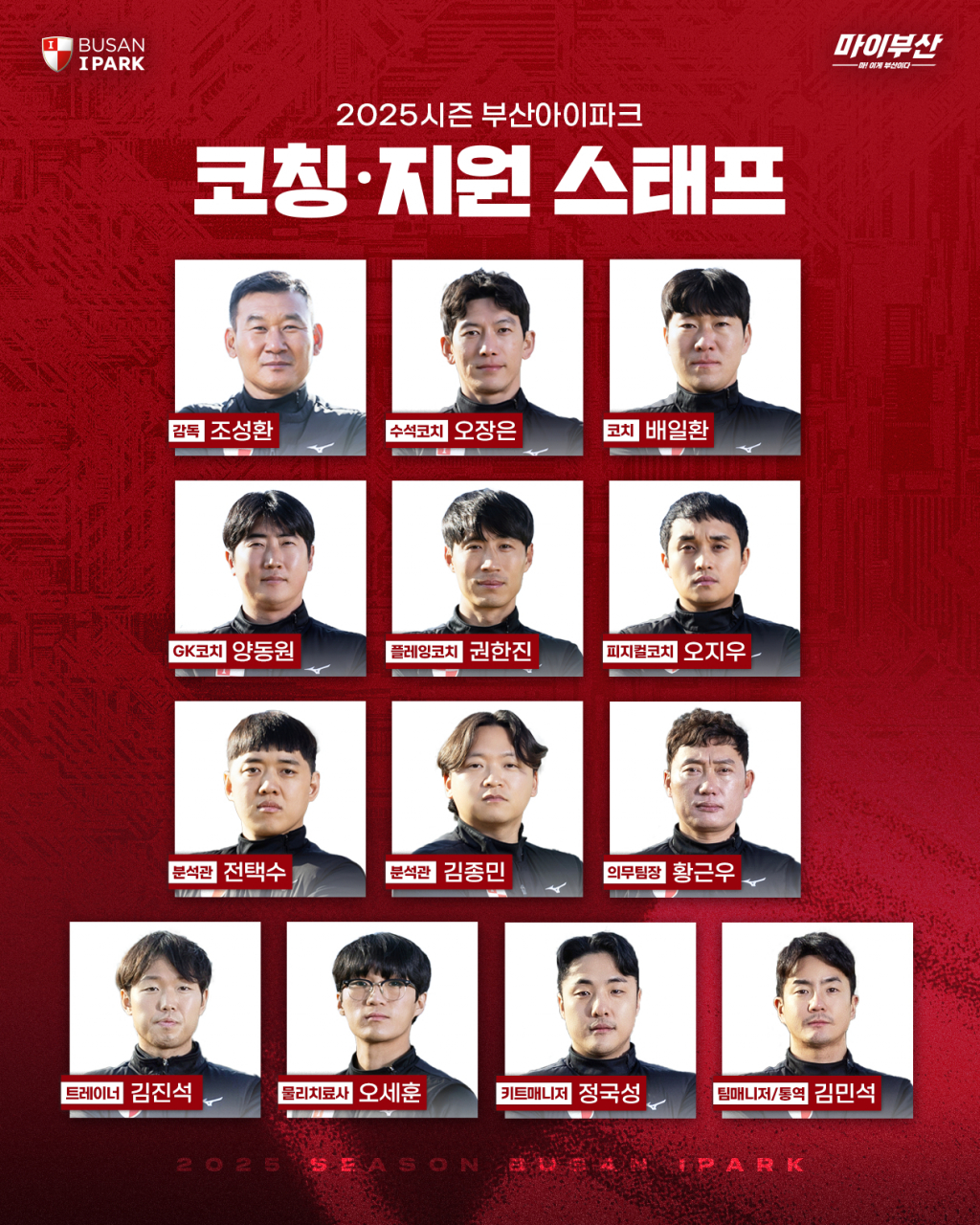 부산은 1일 보도자료를 통해 "구단은 2025시즌을 이끌 코치진 구성을 완료했다. 지난 시즌 중도에 부임한 조성환 감독이 올 시즌 새롭게 코치진을 꾸렸다"며 "오장은·배일환·양동원·권한진 코치, 전택수·김종민 분석관, 황근우 의무팀장·김진석 트레이너·오세훈 물리치료사, 오지우 피지컬 코치가 합류했다"고 발표했다.
