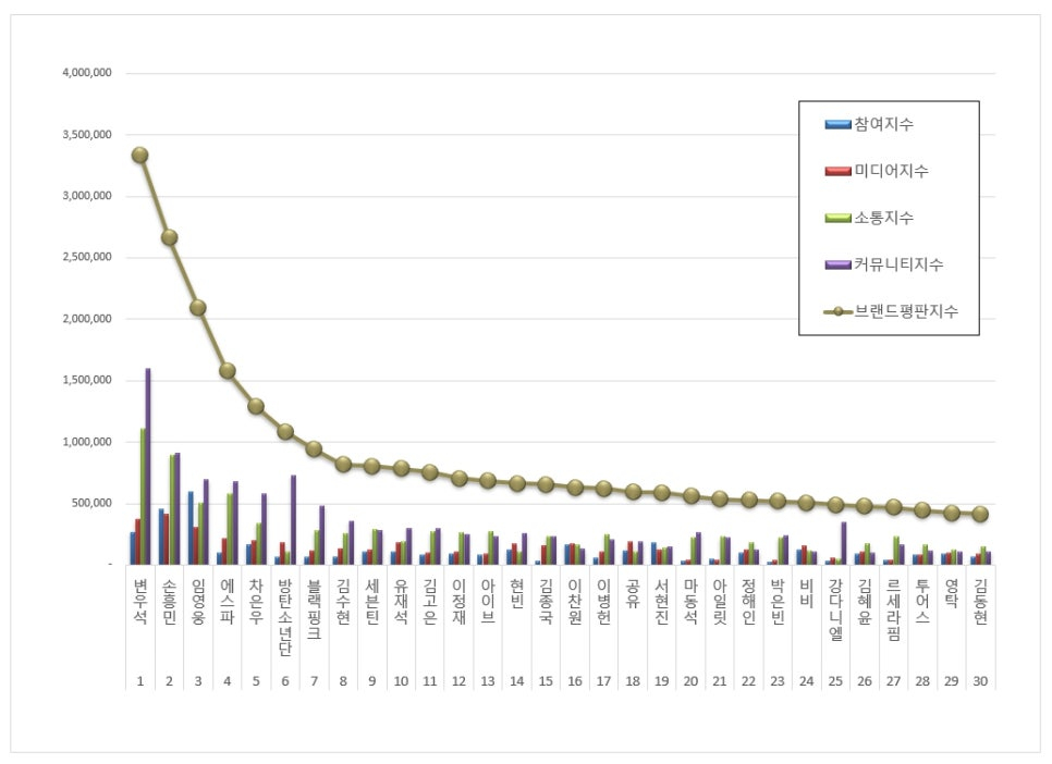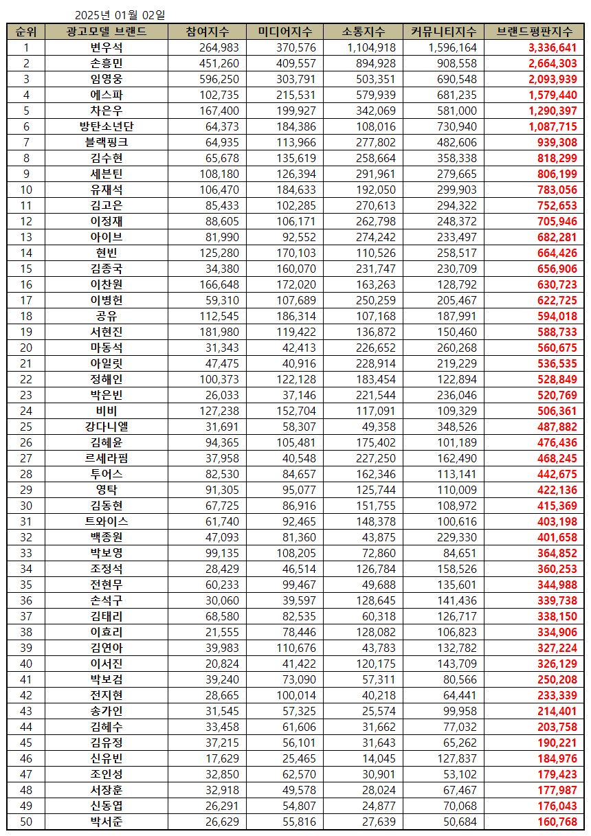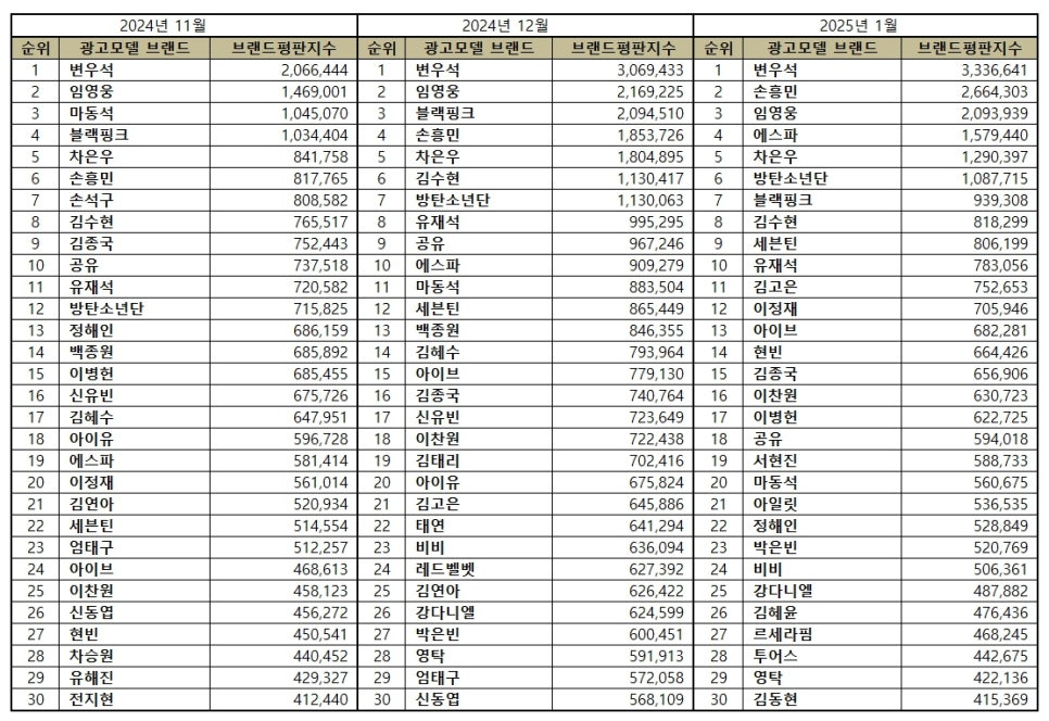 2025년 1월 광고모델 브랜드평판 30위 순위는 변우석, 손흥민, 임영웅, 에스파, 차은우, 방탄소년단, 블랙핑크, 김수현, 세븐틴, 유재석, 김고은, 이정재, 아이브, 현빈, 김종국, 이찬원, 이병헌, 공유, 서현진, 마동석, 아일릿, 정해인, 박은빈, 비비, 강다니엘, 김혜윤, 르세라핌, 투어스, 영탁, 김동현 순으로 분석됐다.