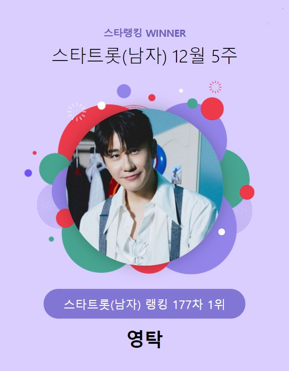 영탁은 지난 12월 26일 오후 3시 1분부터 2일 오후 3시까지 진행된 12월 5주(177차) 스타랭킹 스타트롯 남자 랭킹에서 9만 2186표를 차지하며 굳건한 1위를 유지했다.