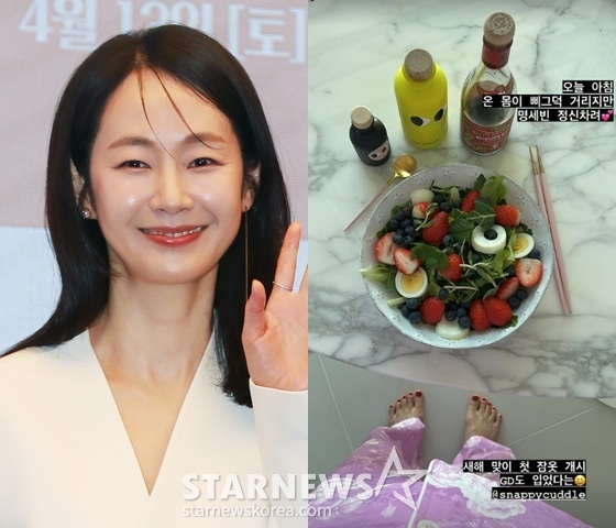 사진 속에는 명세빈이 핑크색 잠옷을 입고 아침 식사를 차린 모습이 있었다.
