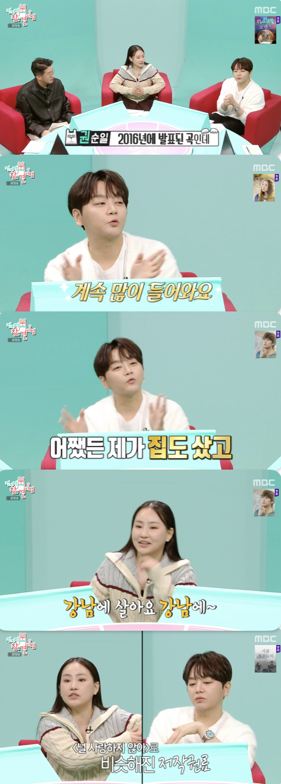 한편 권순일이 작사-작곡한 어반자카파의 '널 사랑하지 않아'가 어반자카파 모든 노래 중 1등 효자곡이라 밝혔다. 저작권료를 묻는 질문에 권순일은 "2016년에 발표된 곡인데 9년이 지났는데도 계속 많이 들어온다. 누적이 굉장히 됐다. 강남에 집도 샀다"라고 전해 모두를 놀라게 했다.