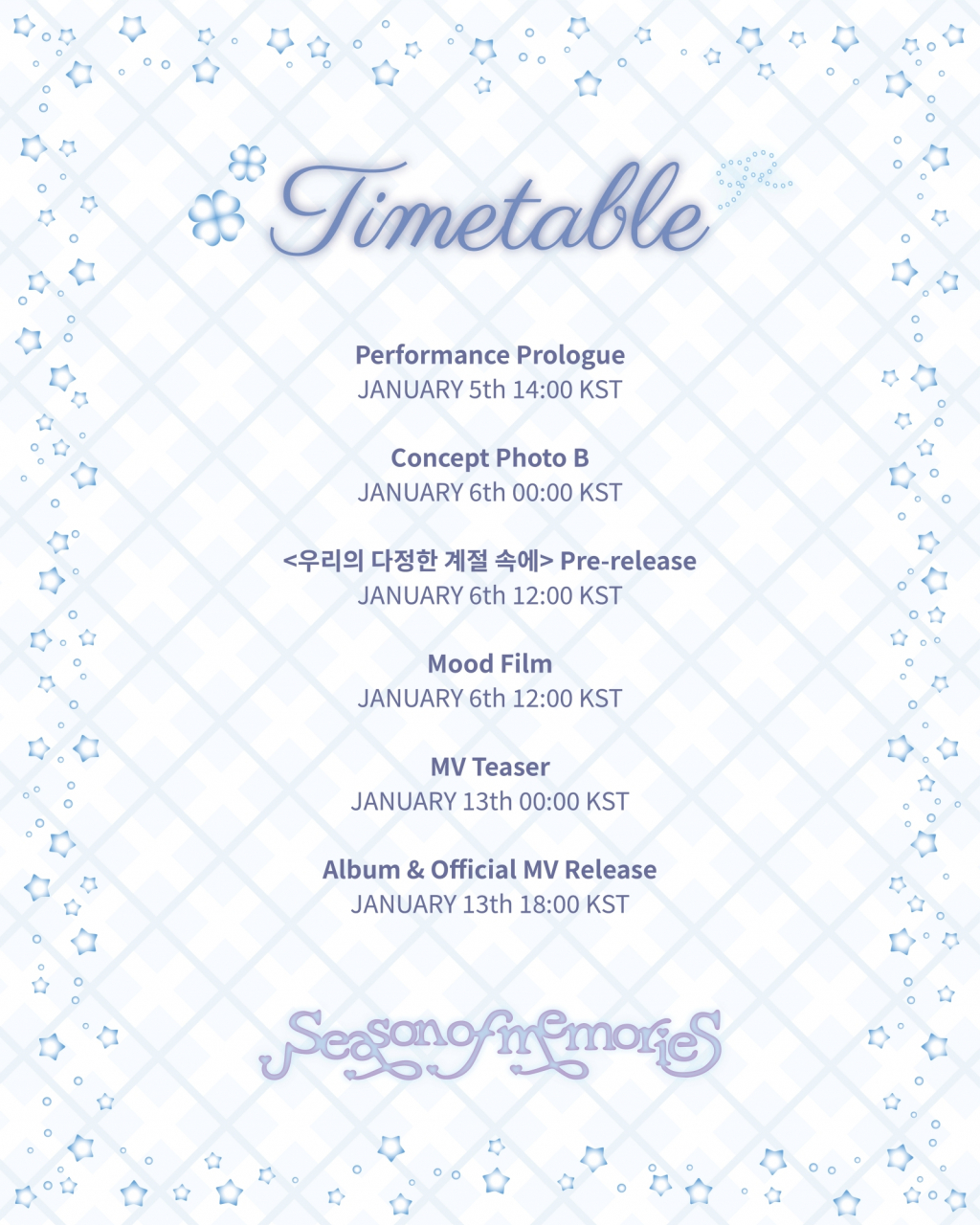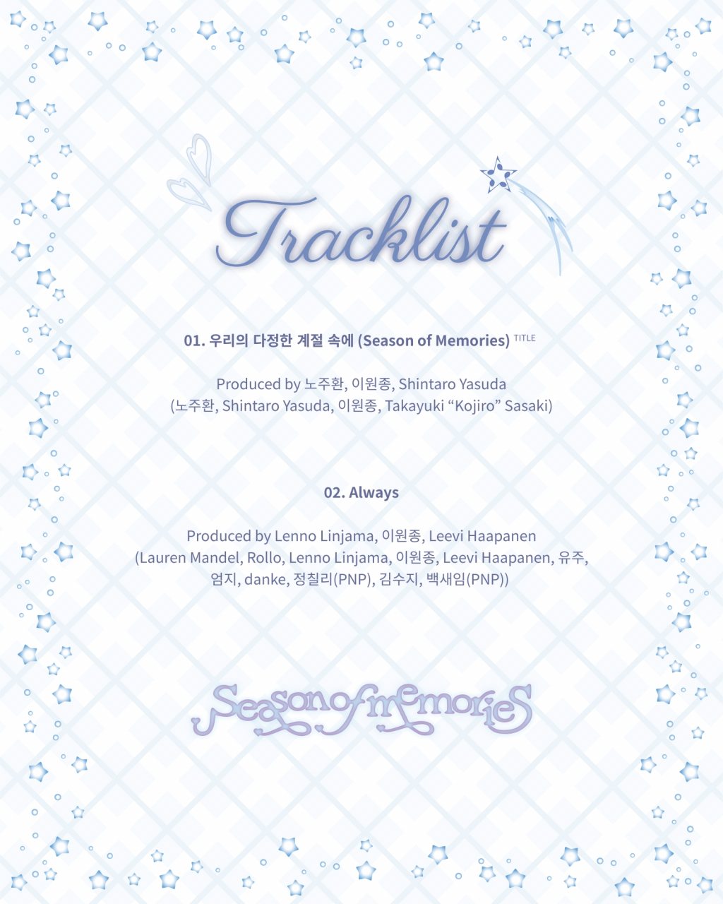 5일 정오 여자친구(소원, 예린, 은하, 유주, 신비, 엄지)와 쏘스뮤직 공식 SNS에 게재된 스페셜 앨범 'Season of Memories'의 트랙리스트에 따르면, 새 음반에는 타이틀곡 '우리의 다정한 계절 속에 (Season of Memories)', 유주와 엄지가 곡 작업에 참여한 'Always' 두 곡이 수록된다.
