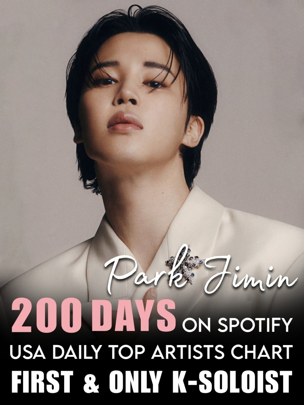 지민은 1월 4일 기준 세계 최대 음원 플랫폼 스포티파이(Spotify) 미국 데일리 톱 아티스트 차트에서 200일 진입 기록을 세웠다. 지민은 해당 차트에 200일 이상 차트인한 최초이자 유일한 K팝 솔로 가수가 됐다.