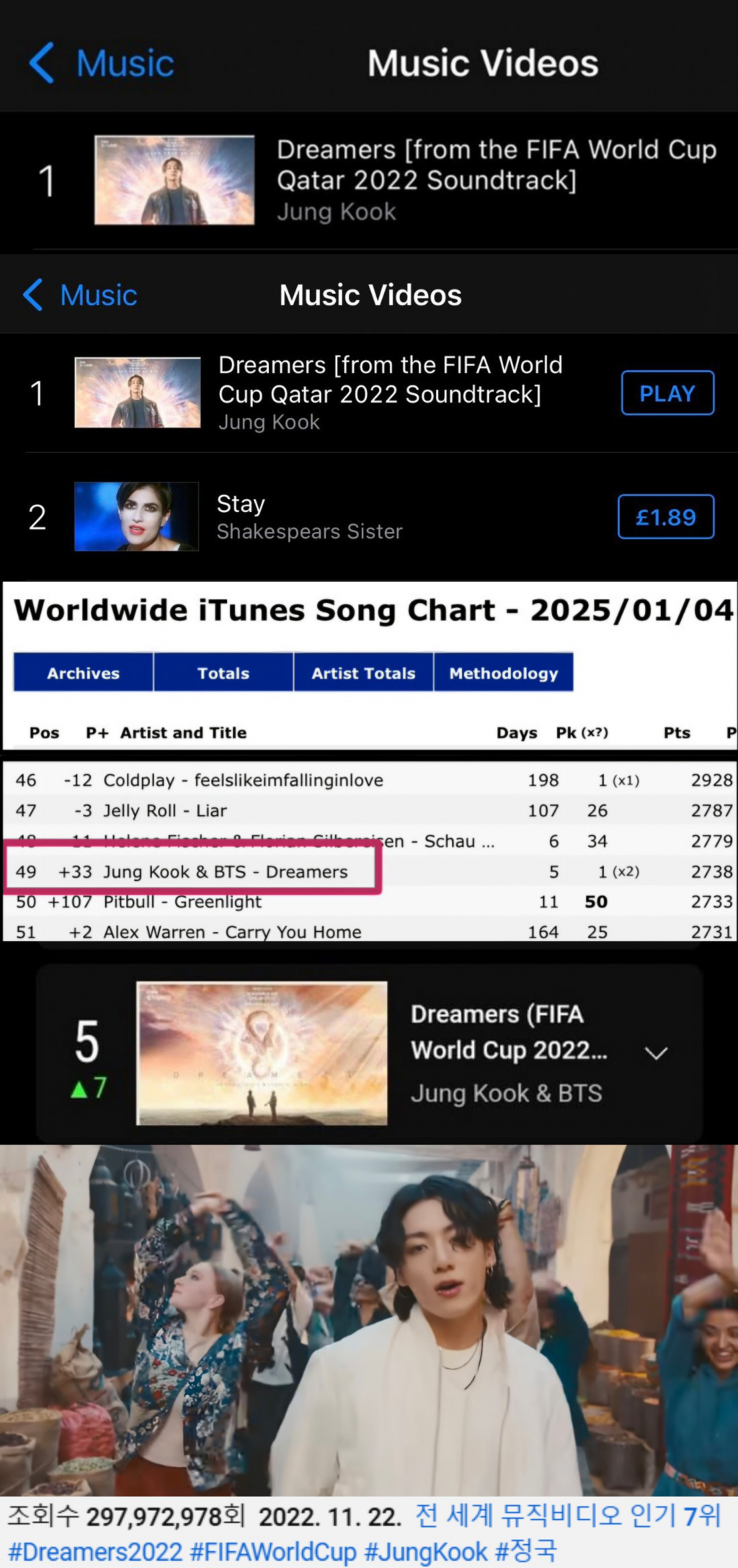 정국이 가창한 '2022 FIFA 카타르 월드컵' 공식 사운드 트랙 'Dreamers'는 1월 7일 기준 총 17개 국가 아이튠즈( iTunes) 톱 뮤직비디오 차트 1위를 차지하며 막강 글로벌 인기를 보여주고 있다.