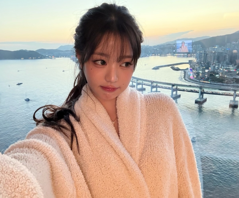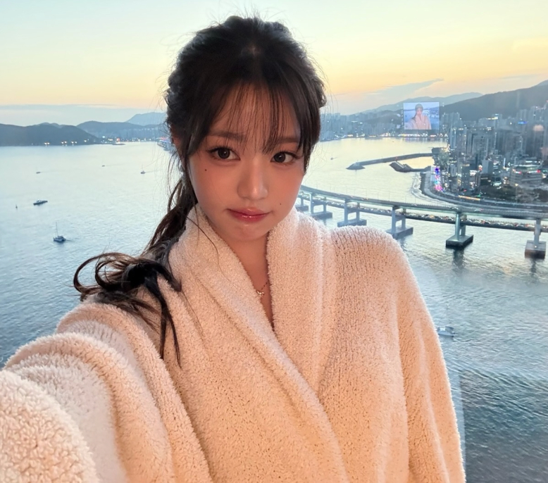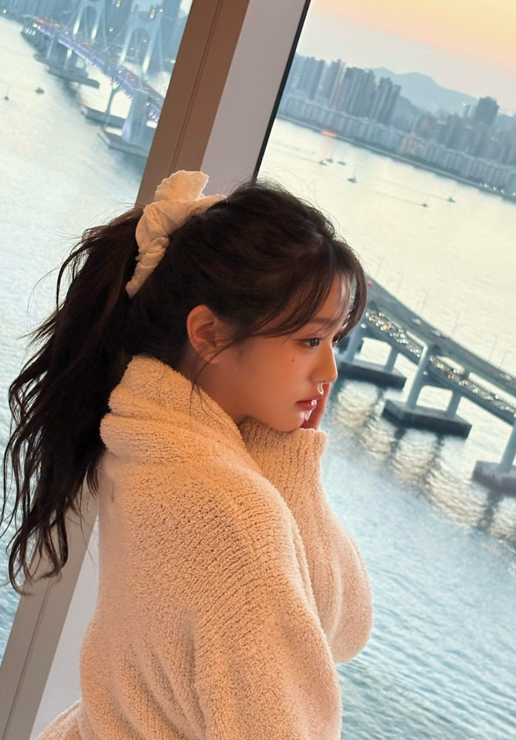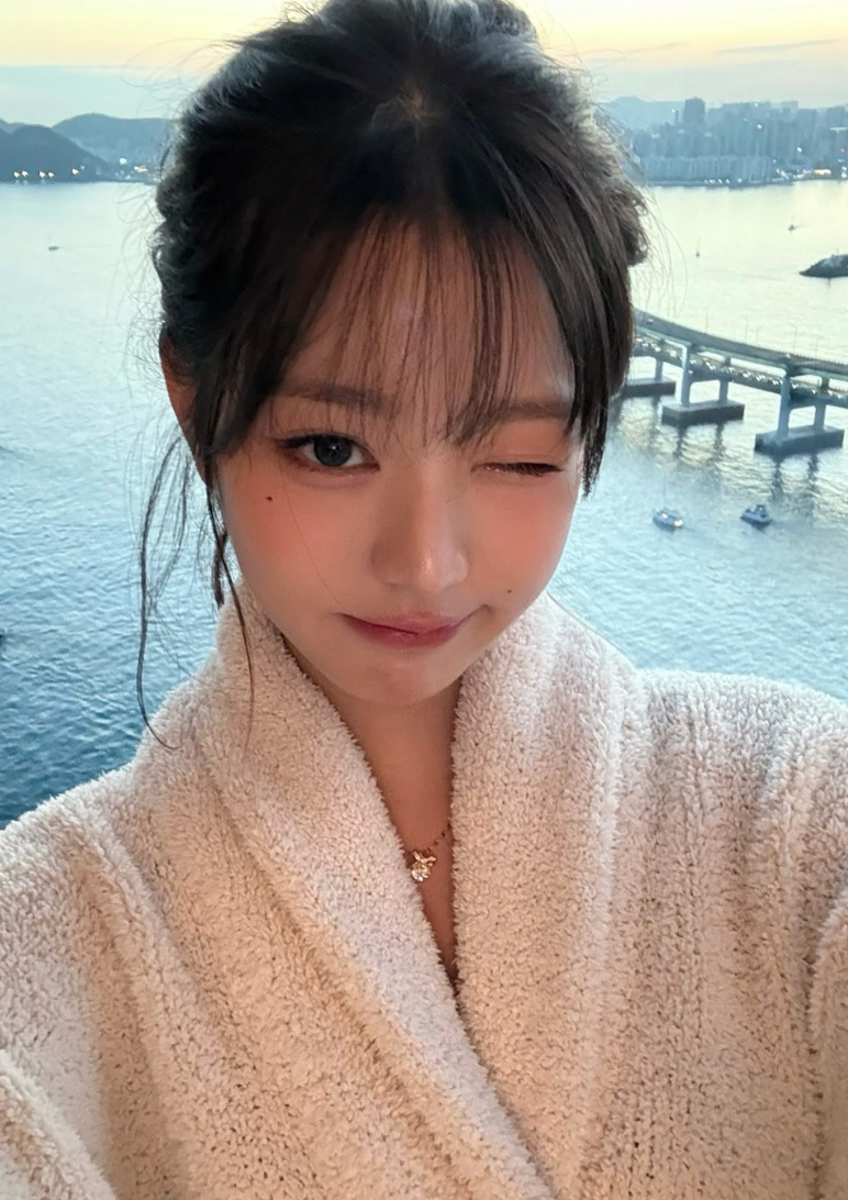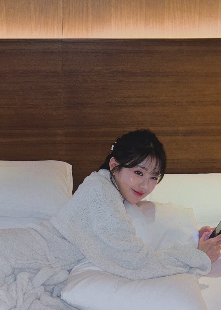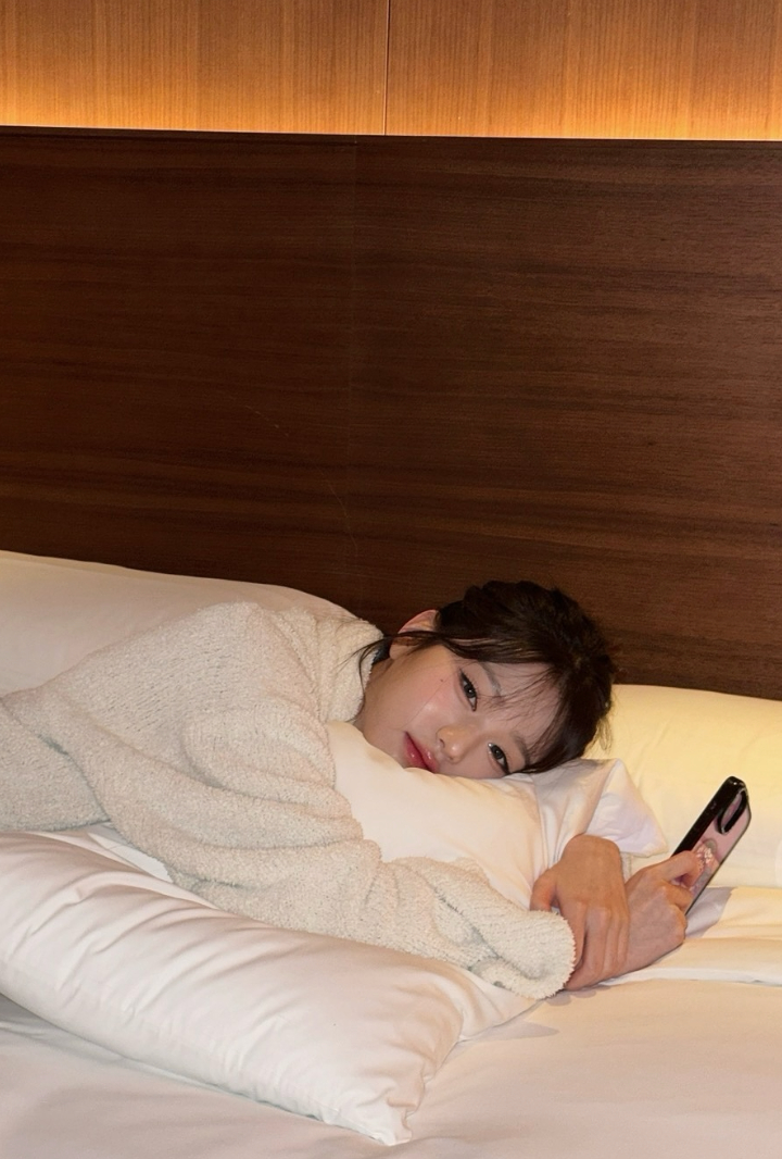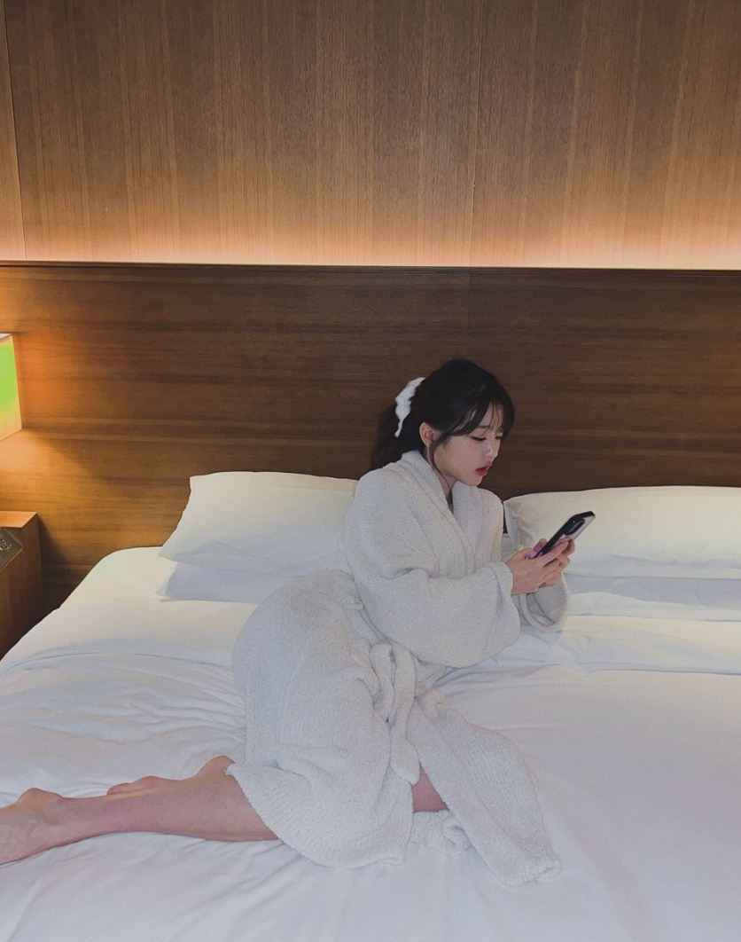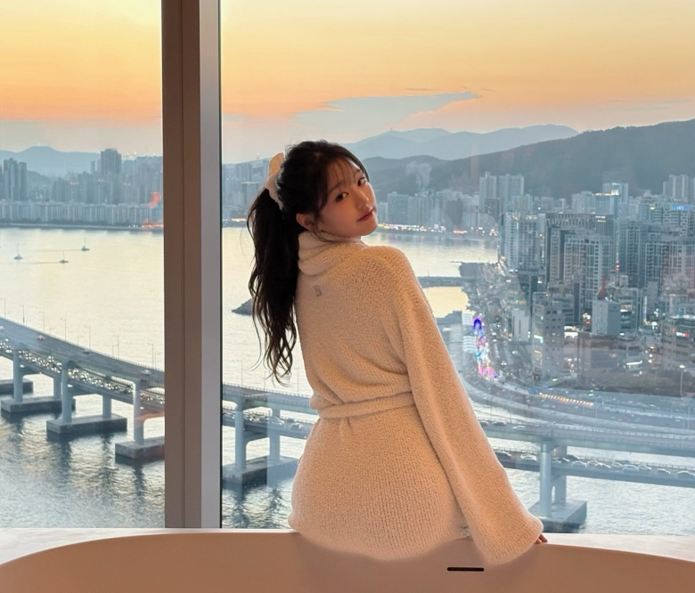 오션 뷰를 배경으로도 포즈를 취한 데 이어 누군가가 찍어준 사진에선 침대 위에 누워 포즈를 취하기도 했다.