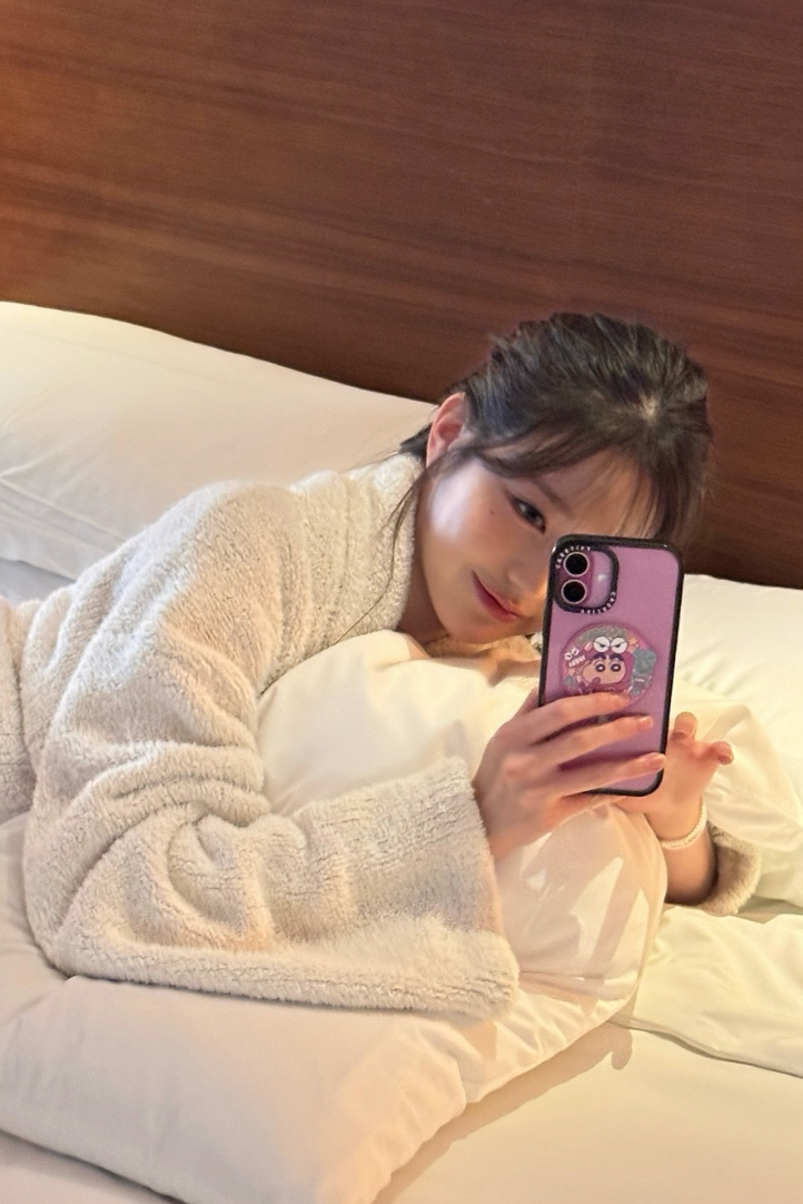 사진에서 장원영은 호텔방에서 샤워 가운만 입고 여러 포즈를 취하고 있다.