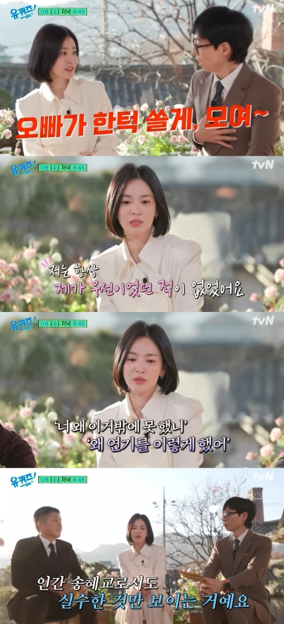 송혜교는 8일 방송되는 tvN '유퀴즈 온더 블럭'에 모습을 드러낼 예정이다. 본 방송을 앞두고 공개된 예고편을 통해 송혜교는 유재석과의 토크 케미로 기대감을 높였다. 송혜교의 토크쇼 출연은 무려 23년만이다.