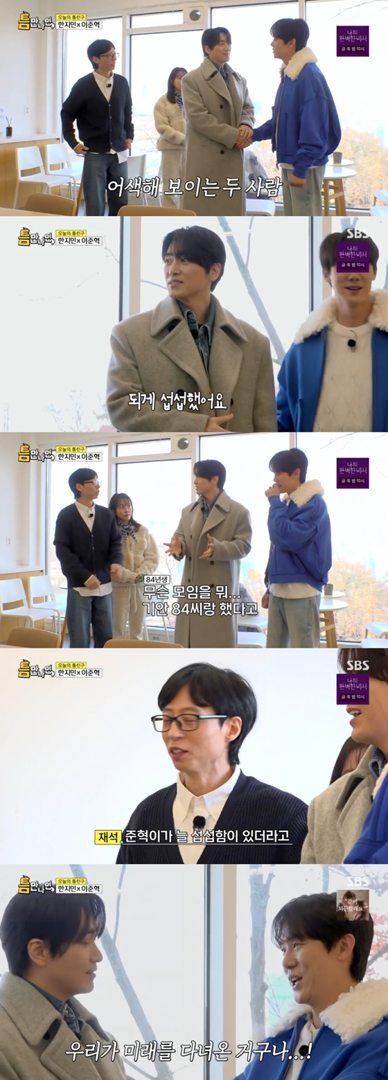이를 본 유재석이 "이준혁은 항상 좀 섭섭함을 갖고 있다"며 웃겨하자 유연석은 "다음 주에 84 모임이 있다. 우리는 다음 주에 만날 예정"이라며 이준혁을 달래 웃음을 안겼다.