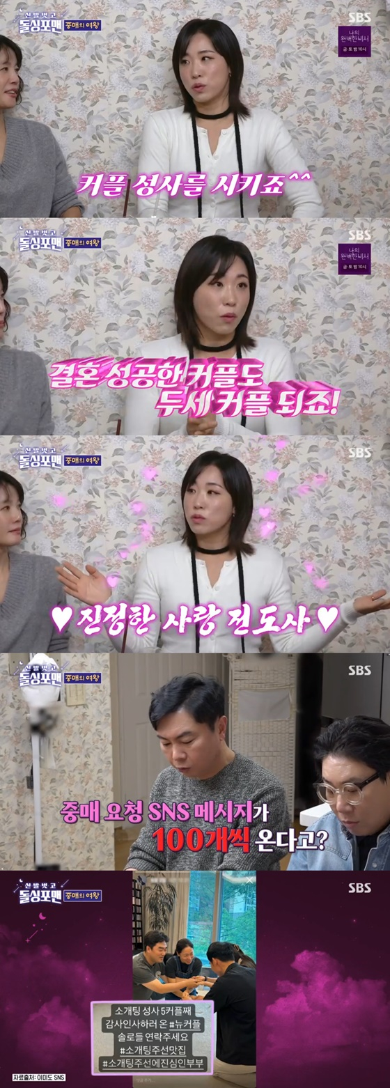 중매 요청 SNS 메시지만 무려 100통 넘게 들어올 정도라고. 이미도는 "남편과 제가 모솔 두 명을 성사시킨 적이 있는데, 그 커플이 우리집에 감사 인사를 온 날 사진을 찍어서 SNS에 올렸더니 메시지가 100통 넘게 온 거다. 그때 '이렇게 외로운 사람이 많구나. 열심히 해야겠다'는 생각을 했다"고 설명했다.