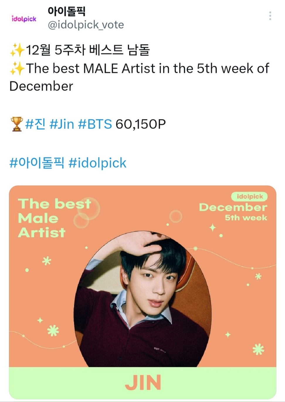 방탄소년단(BTS) 진이 아이돌픽(idolpick) 위클리 투표에서 최다 득표로 전체 1위를 차지하며 인기를 빛냈다.