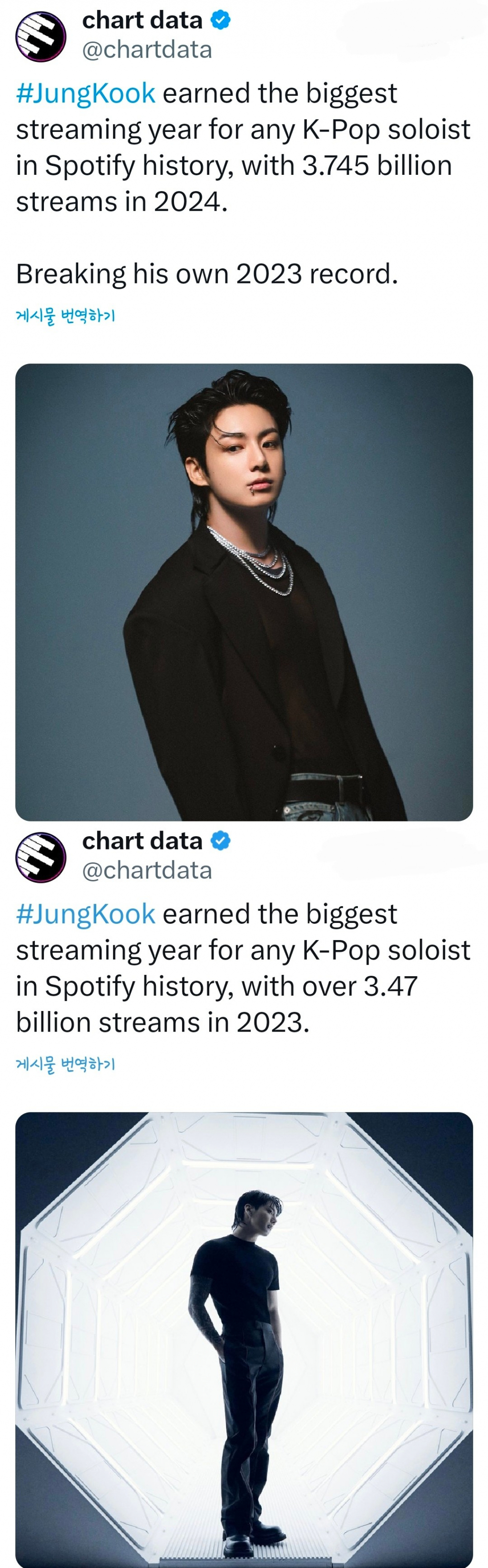 '차트데이터'(chart data)에 따르면, 정국은 2024년 한 해 동안 스포티파이에서 총 37억 4500만 건에 달하는 스트리밍을 달성했다.