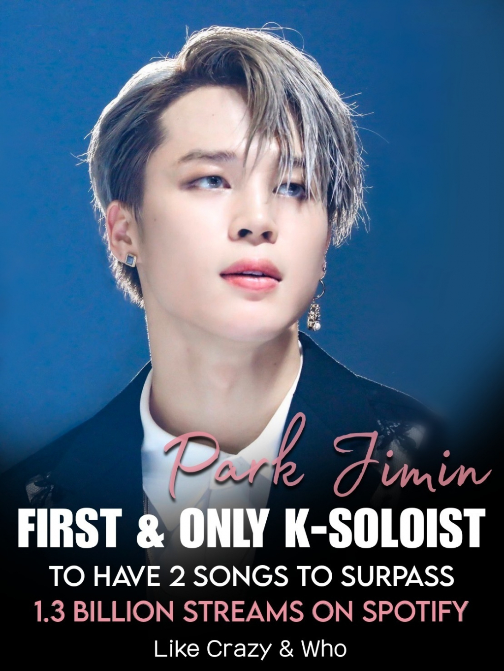이에 앞서 지민은 1집 '페이스'(FACE) 타이틀곡 '라이크 크레이지'(Like Crazy)가 작년 10월 스포티파이 13억 스트리밍을 달성한 바 있어 이제 스포티파이에서 13억 이상 스트리밍의 솔로곡 2곡을 보유한 최초이자 유일한 한국 솔로 가수가 되었다.