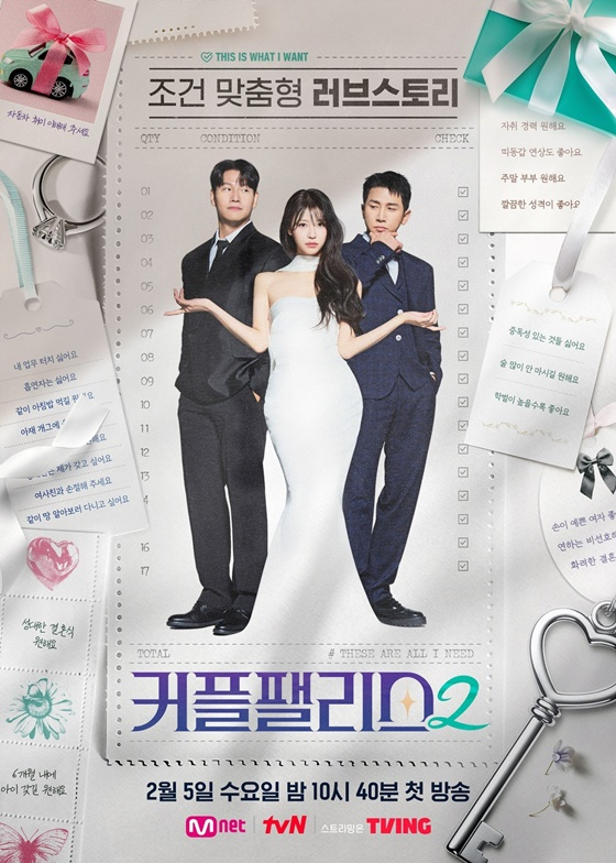 편성 확정과 함께 공개된 '커플팰리스2' 콘셉트 포스터에는 '조건 맞춤형 러브 스토리'라는 문구와 함께 김종국, 유세윤, 미주 세 MC의 모습이 담겼다. 웨딩드레스를 입은 미주를 중심으로 탐색전을 벌이듯 서로 다른 곳을 바라보는 김종국, 유세윤이 삼각구도를 이루며 '커플팰리스2'에서 펼쳐질 예측불허한 여정을 향한 기대감을 불어넣고 있다.