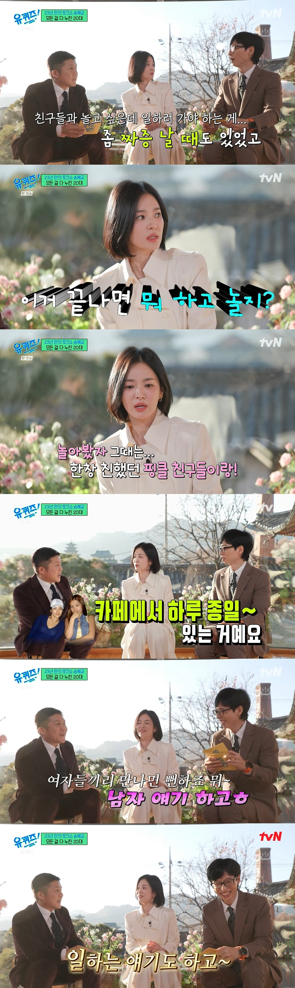 그렇다면 송혜교는 당시 친구들을 만나면 무슨 이야기를 했을까. 그는 "여자들끼리 만나면 뻔하죠 뭐. 남자 얘기 하고 일하는 얘기도 한다"라고 솔직하게 고백해 시청자들을 폭소케 만들었다.