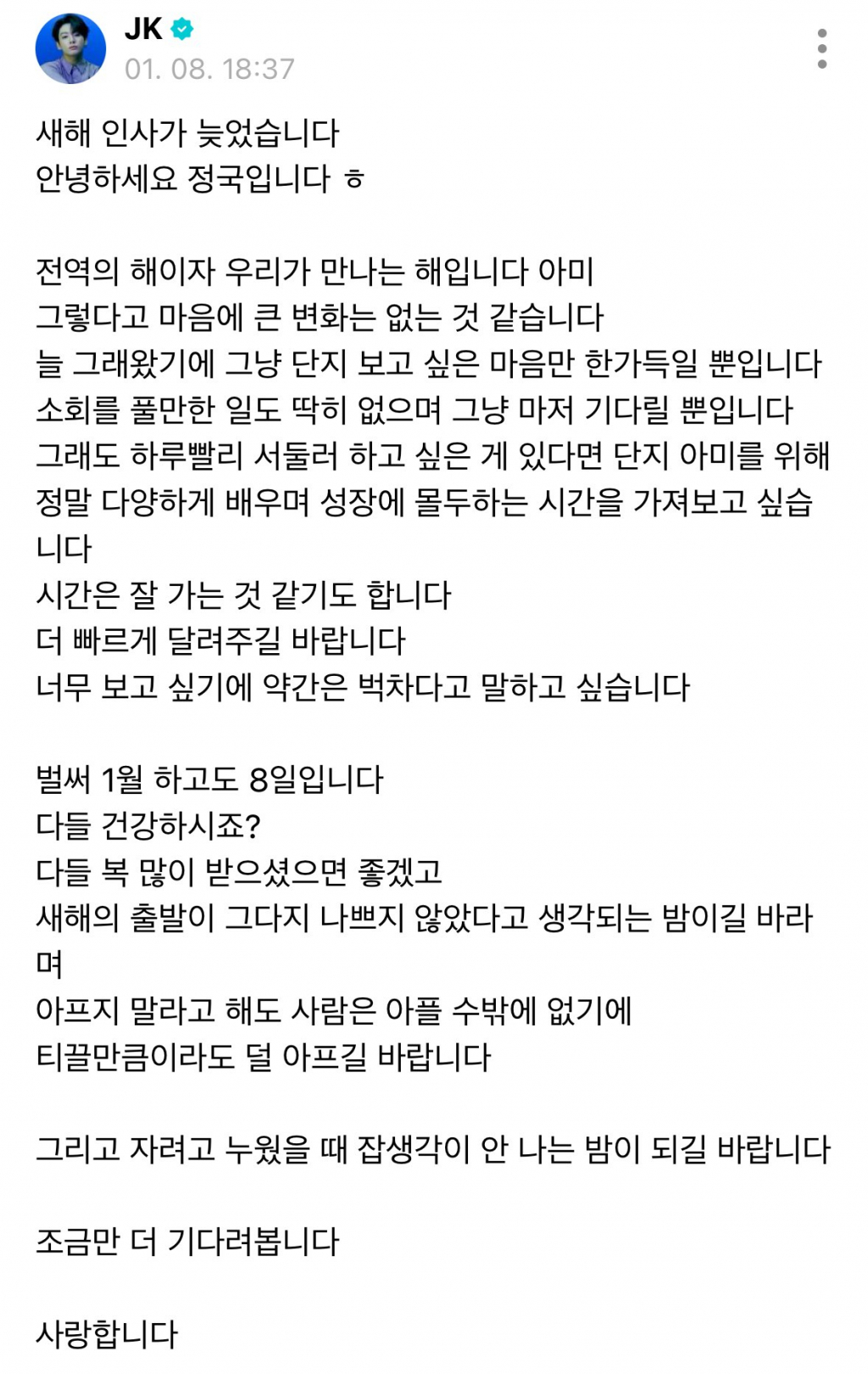 정국은 "벌써 1월 하고도 8일입니다 다들 건강하시죠? 다들 복 많이 받으셨으면 좋겠다" 라며 "새해의 출발이 그다지 나쁘지 않았다고 생각되는 밤이길 바라며 아프지 말라고 해도 사람은 아플 수밖에 없기에 티끌 만큼이라도 덜 아프길 바랍니다" 라고 새해 인사를 남기면서 팬들의 건강도 살뜰히 챙기는 다정함을 보였다.