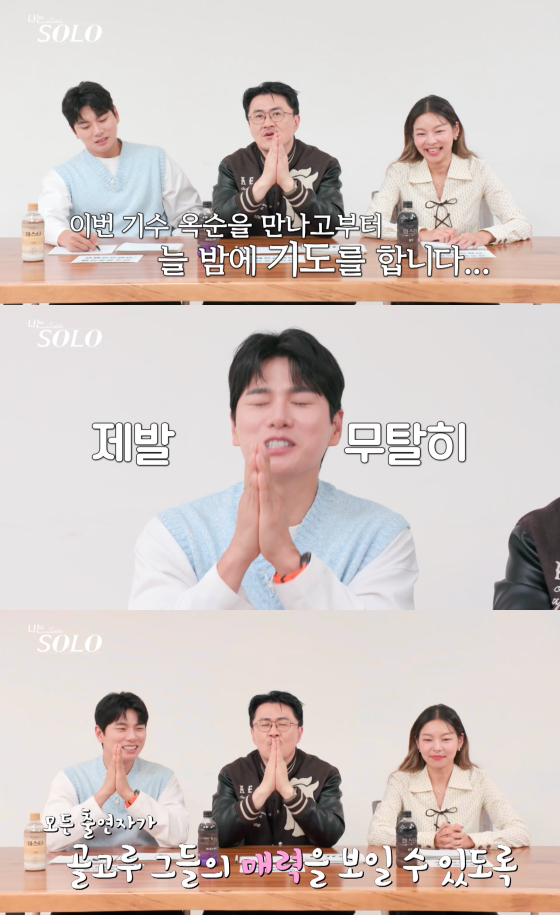 두 사람의 데이트를 본 데프콘은 돌연 손을 모으더니 "저는 이번 기수 시작하면서, 옥순을 만나면서 매일 밤에 기도를 한다"고 말하며 눈을 지그시 감았다.