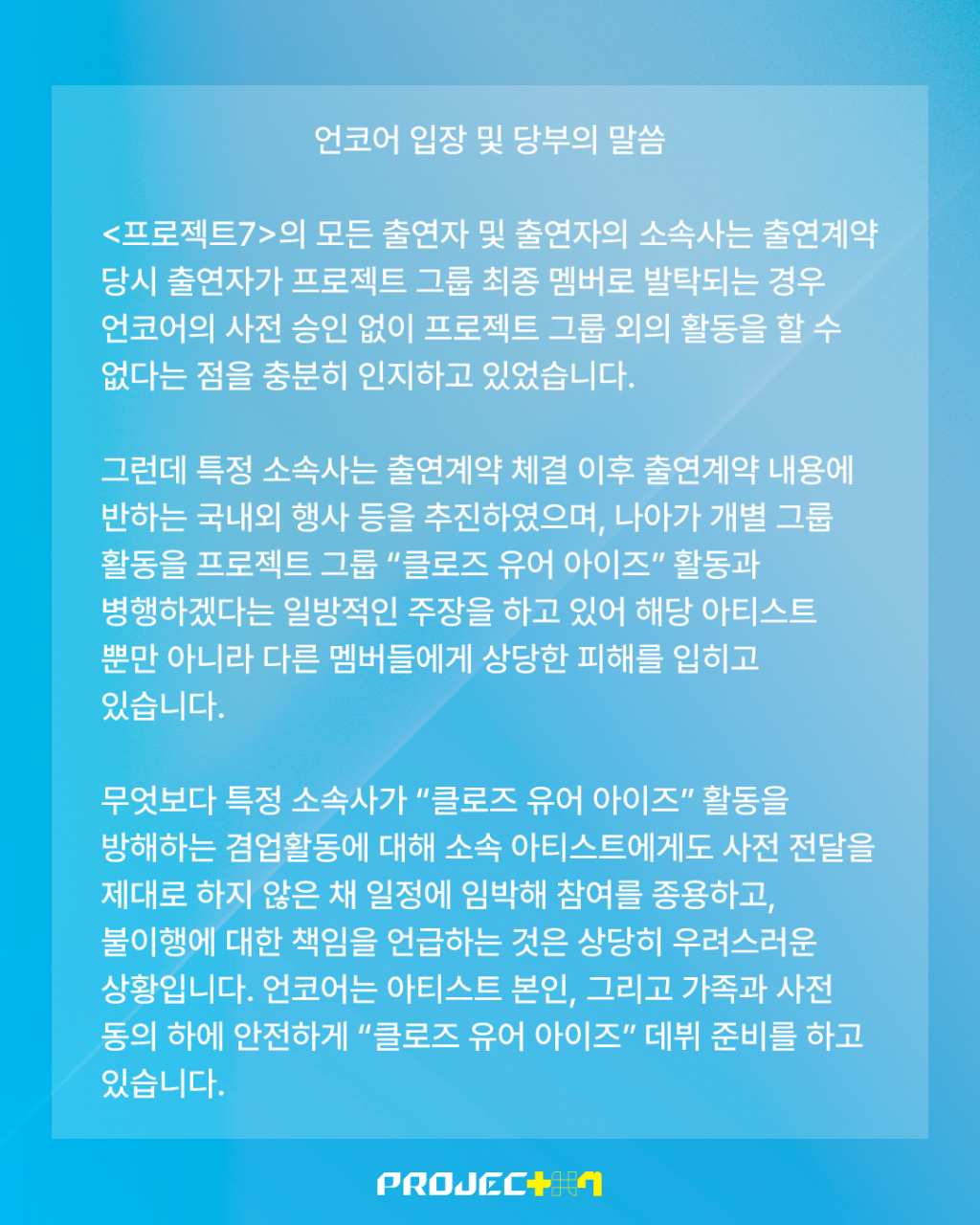 언코어는 "'프로젝트7'의 여정을 함께 해주신 월드 어셈블러님들, 출연자, 제작진의 노고가 무색해지는 특정 소속사의 이기적인 행동을 좌시하지 않겠습니다. 언코어는 특정 소속사의 의도적인 활동 방해 행위가 계약 위반, 부정경쟁행위 등 불법행위에 해당한다는 점을 엄중히 경고하며 모든 법적 조치를 취할 것입니다"라고 덧붙였다.