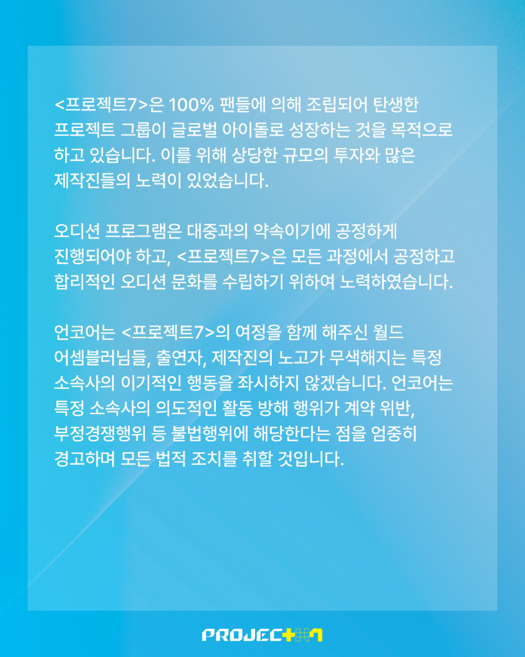 오디션 프로그램은 대중과의 약속이기에 공정하게 진행되어야 하고, <프로젝트7>은 모든 과정에서 공정하고 합리적인 오디션 문화를 수립하기 위하여 노력하였습니다.