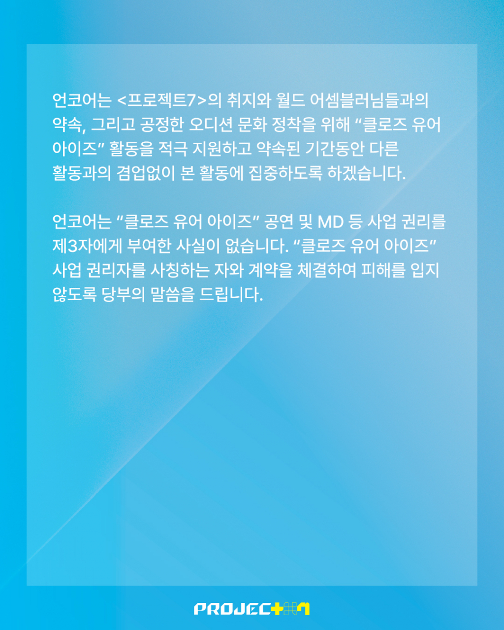 언코어는 <프로젝트7>의 취지와 월드 어셈블러님들과의 약속, 그리고 공정한 오디션 문화 정착을 위해 "클로즈 유어 아이즈" 활동을 적극 지원하고 약속된 기간동안 다른 활동과의 겸업없이 본 활동에 집중하도록 하겠습니다.