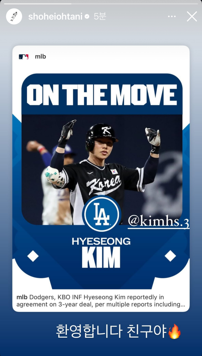김혜성의 에이전트에 따르면 오타니의 조언이 다저스행을 결정하는데 한몫을 했다고 알려졌는데 그는 김혜성의 계약 소식이 밝혀지자 자신의 소셜네트워크서비스(SNS)에 "환영합니다 친구야"라고 직접 한글 메시지를 남겨 화제가 되기도 했다.