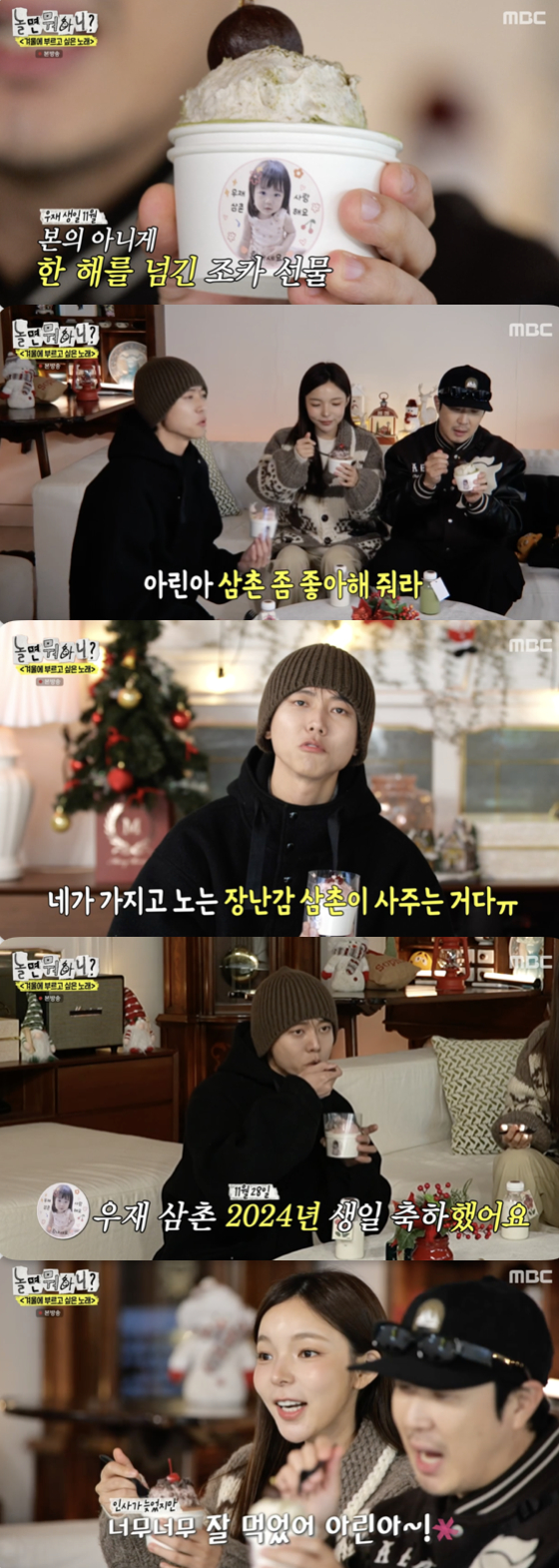 다른 멤버들이 "아린아 너무 고마워, 사랑해"라며 인사하는 사이 주우재는 "아린아, 삼촌 좀 좋아해 주라. 네가 가지고 노는 장난감 다 삼촌이 사준 거다"라고 귀여운 생색을 내 보는 이들의 웃음을 자아냈다.