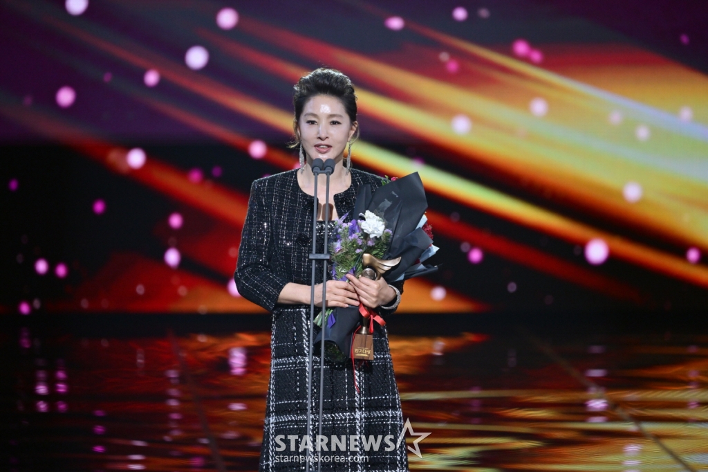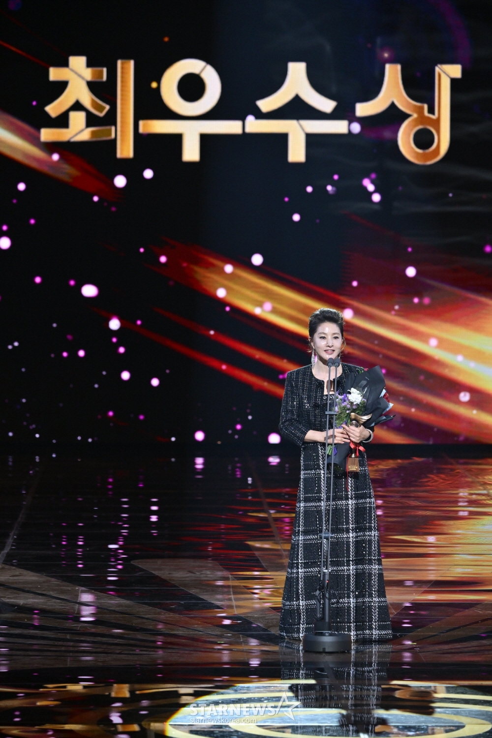 배우 박지영이 11일 오후 KBS 2TV에서 방송된 '2024 KBS 연기대상'에서 최우수상을 수상한 뒤 소감을 말하고 있다.