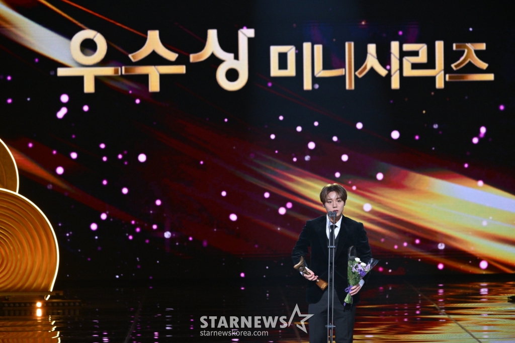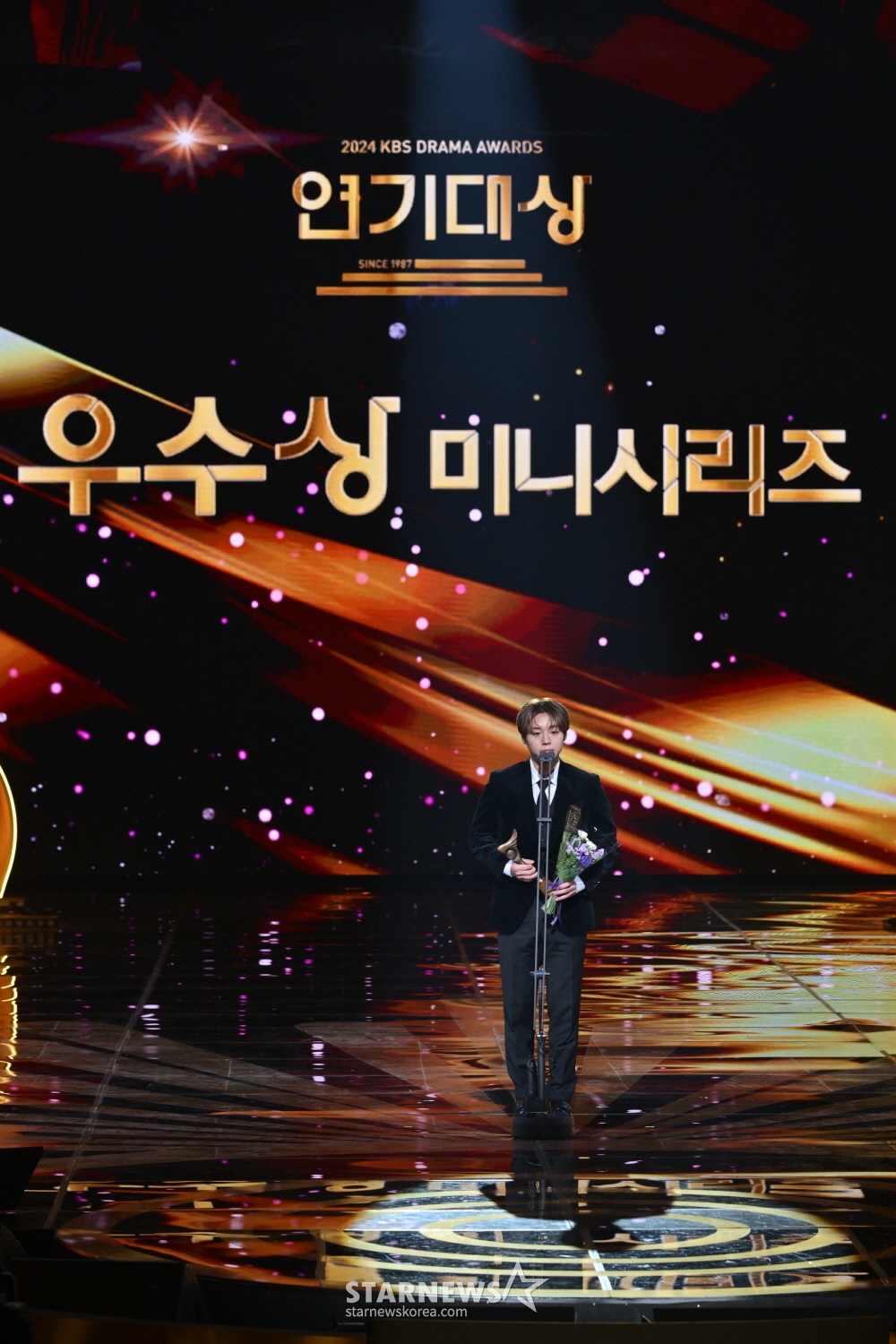 배우 박지훈이 11일 오후 KBS 2TV에서 방송된 '2024 KBS 연기대상'에서 미니시리즈 우수상을 수상한 뒤 소감을 말하고 있다.