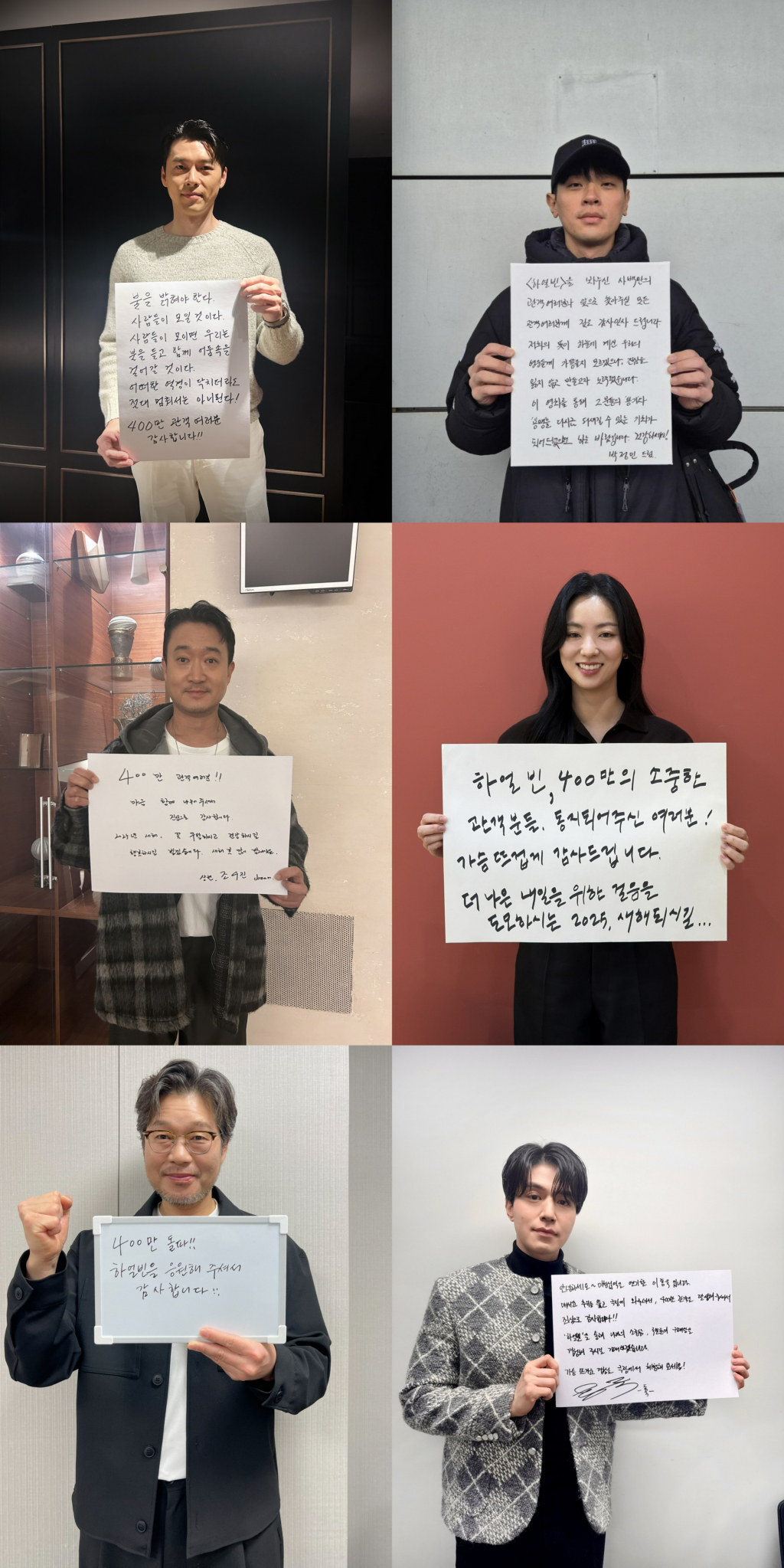 "400만 관객 여러분! 광복 80주년, 안중근 의사는 어디 있습니까? 꼭 기억해주세요"(우민호 감독), "불을 밝혀야 한다. 사람들이 모일 것이다. 사람들이 모이면 우리는 불을 들고 함께 어둠 속을 걸어갈 것이다. 어떠한 역경이 닥치더라도 절대 멈춰서는 아니된다! 400만 관객 여러분 감사합니다!"(현빈), "'하얼빈' 을 봐주신 사백만의 관객 여러분과 앞으로 찾아 주실 모든 관객 여러분께 깊은 감사 인사드립니다. 저희의 뜻이 하늘에 계신 우리의 영웅들께 가닿을지 모르겠으나, 진심을 잃지 않고 만들고자 노력했습니다. 이 영화를 통해 그 분들의 용기와 용맹을 다시금 되새길 수 있는 기회가 되어드렸으면 하는 바람입니다. 건강하세요!"(박정민), "'하얼빈' 400만의 소중한 관객분들, 동지 되어주신 여러분! 가슴 뜨겁게 감사드립니다. 더 나은 내일을 위한 걸음을 도모하시는 2025, 새해 되시길"(전여빈), "400만 관객 여러분, 모든 것을 포기하고 싶을 때 다시 한 걸음! 안중근처럼, 하얼빈처럼, 2025 용기 있게 화이팅!"(박훈), "400만 돌파! '하얼빈'을 응원해 주셔서 감사합니다"(유재명), "매서운 추위를 뚫고 극장에 와주셔서, 400만 관객을 달성해 주셔서 진심으로 감사합니다! '하얼빈'을 통해 나라의 소중함, 국민들의 위대함을 경험해 주시길 기대하겠습니다. 가슴 뜨거운 경험을 극장에서 체험해보세요!"(이동욱)까지 하얀 종이를 가득 채운 배우들의 영화를 향한 진심이 느껴진다.