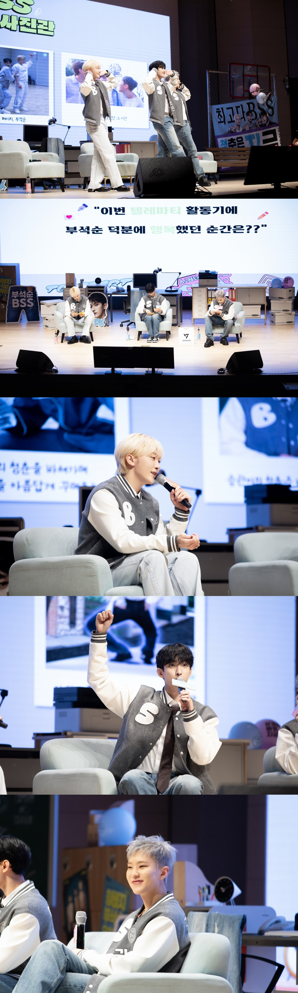 부석순은 지난 12일 서울 강남구 CG아트홀에서 싱글 2집 'TELEPARTY' 발매를 기념한 팬 파티 '청바지 입고 안드로메다까지'를 개최했다. 멤버들은 다채로운 코너와 무대, 무반주 라이브까지 선보이며 남다른 팬 사랑을 드러냈다.