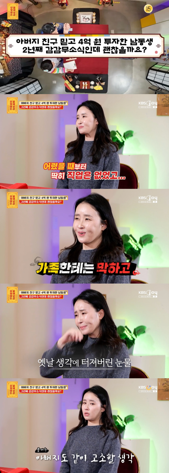 이날 사연자는 "기혼자인 남동생이 갑자기 밤에 전화가 와서 '누나 나 좀 살려줘'라고 하더라. 들어 보니 고물상을 해서 모은 4억 원을 아버지 지인에게 투자해서 돈을 다 날릴 위기라더라"고 운을 뗐다.