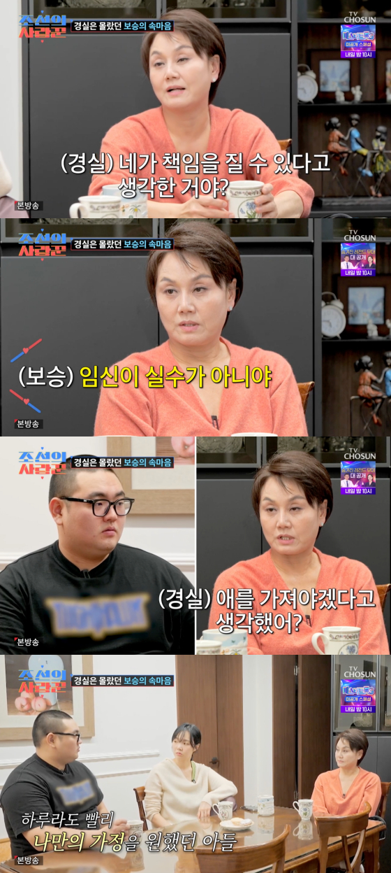 반면 이경실은 23살 어린 나이에 가장이 된 아들에 대해 "군대도 안 다녀왔는데 어쩌겠다는 건지 모르겠다. 본인 하나도 책임을 못 지고 있다. 아들의 (혼전임신) 얘기를 듣고는 어떻게 할 수가 없더라. 캄캄했다"고 당시를 떠올렸다.