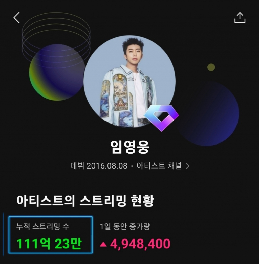 임영웅은 1월 14일 국내 주요 음원 플랫폼 멜론(Melon)에서 누적 스트리밍 111억 회를 넘어섰다. 이날 기준 임영웅의 멜론 누적 스트리밍 수는 111억 23만 회였다.