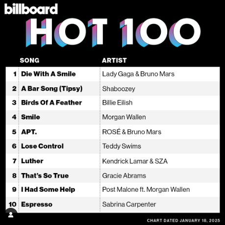 14일(한국 시각) 공개된 최신 차트에 따르면 '아파트'는 2025년 1월 18일자 빌보드 핫100 차트 5위에 이름을 올리며 직전 주 5위와 동률을 이뤘.