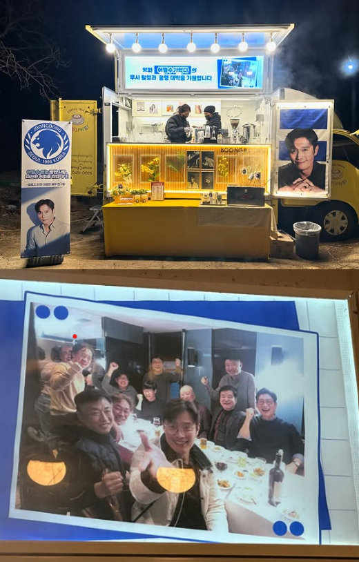 공개된 사진 속에는 이병헌의 고등학교 동창생들이 영화 '어쩔수가없다' 촬영장에 보낸 커피차가 담겨있다. 해당 커피차에는 '어쩔 수 없는 병헌 사랑, 따끈한 커피로 전합니다'라는 글귀가 담겨있어 눈길을 끈다.