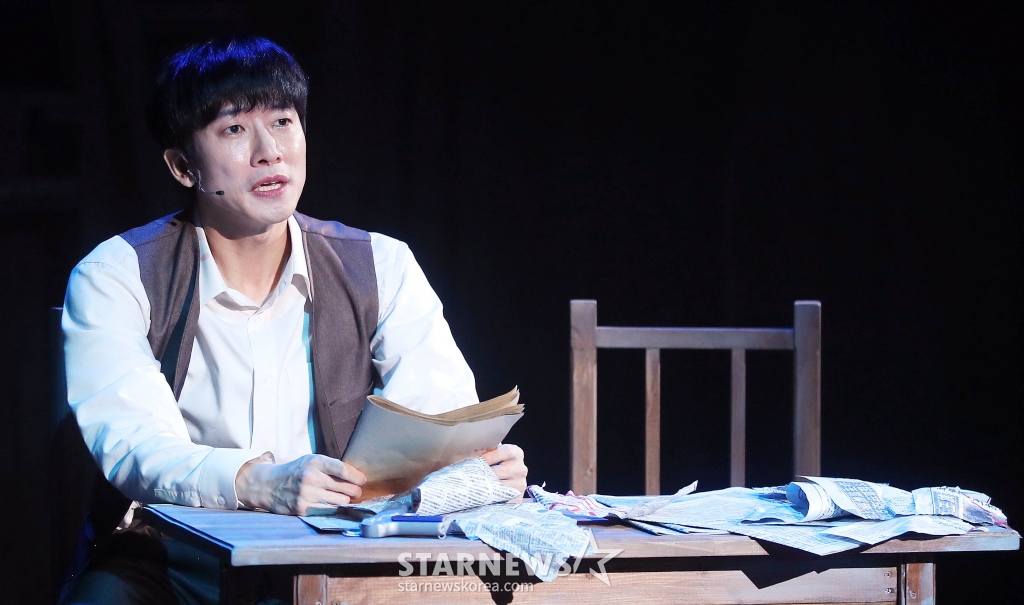 뮤지컬 배우 성태준이 16일 오후 서울 마포구 서강대학교 메리홀에서 진행된 뮤지컬 '어제의 시는 내일의 노래가 될 수 있을까' 프레스콜에서 열연하고 있다.