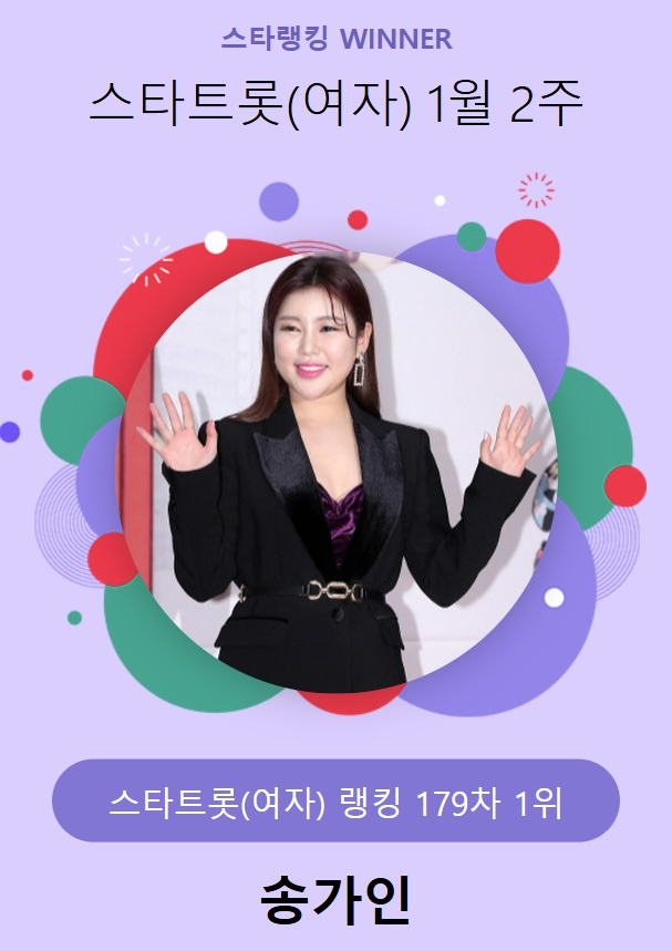 송가인은 지난 9일 오후 3시 1분부터 16일 오후 3시까지 진행된 1월 2주(179차) 스타랭킹 스타트롯 여자 랭킹 투표에서 김태연, 김다현을 꺾고 1위를 차지했다.