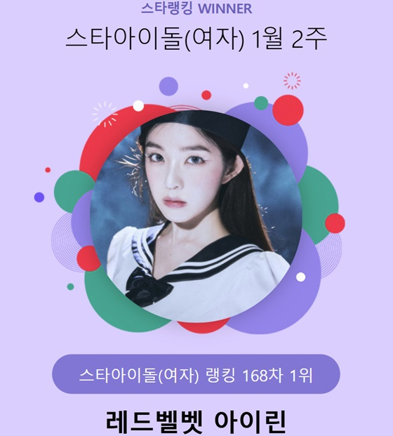 아이린은 지난 9일 오후 3시 1분부터 16일 오후 3시까지 진행된 1월 2주(168차) 스타랭킹 여자 아이돌 랭킹 투표에서 1만 5506표를 받으며 정상에 올랐다.