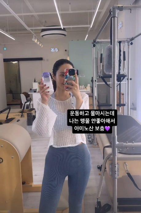 박지윤은 16일 자신의 계정에 "얼마만의 운동이지", "운동하고 물 마시는데 나는 맹물 안 좋아해서 아미노산 보충"이라며 사진을 게재했다.