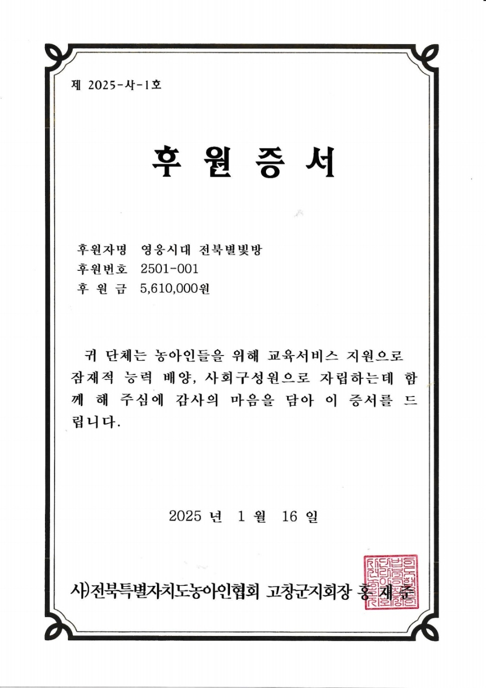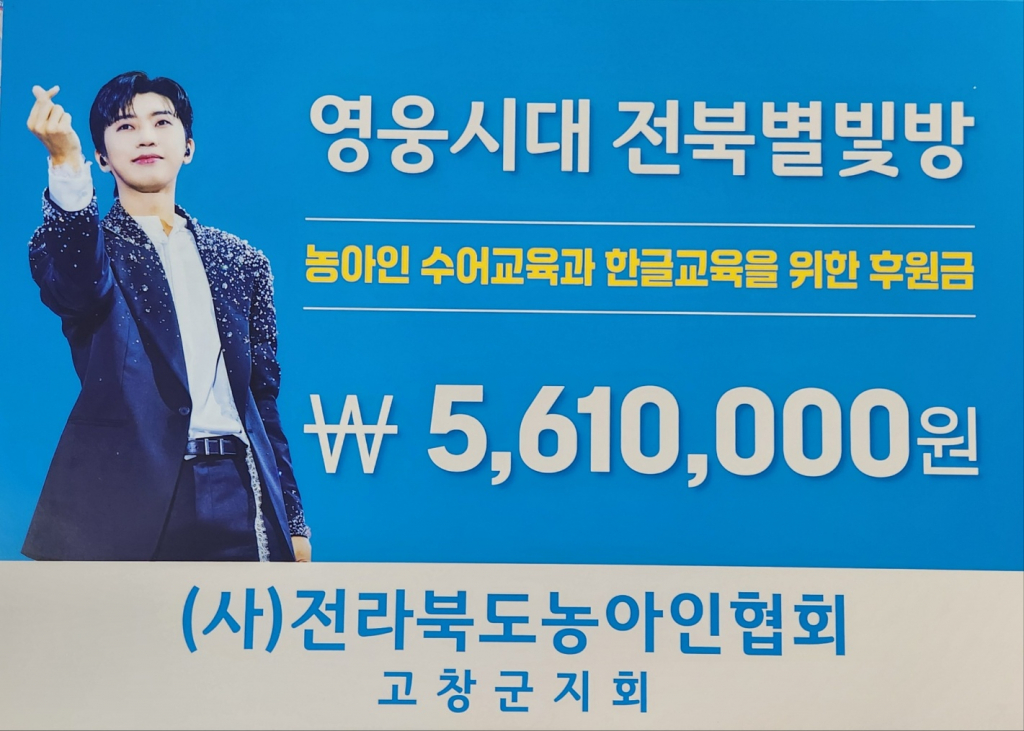 임영웅 팬클럽 '영웅시대 전북별빛방'은 1월 16일 (사)한국농아인협회 전북특별자치도협회 고창군지회에 기부금 561만 원을 전달했다.
