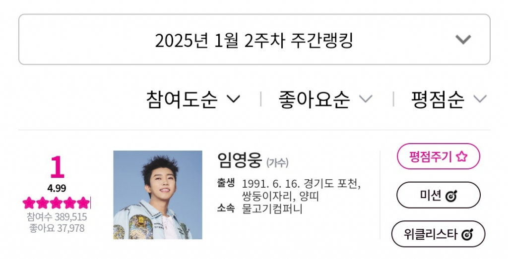 임영웅은 1월 2주차 아이돌차트 평점랭킹에서 38만 9515표를 얻어 1위를 차지했다.