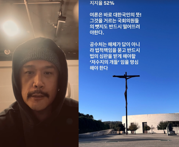 또한 "지지율 52%"라고도 적고 "여론은 바로 대한민국의 뜻! 그것을 거르는 국회의원들의 뱃지도 반드시 떨어뜨려야 한다. 공수처는 해체가 답이 아니라 법적 책임을 묻고 반드시 법의 심판을 받게 해야할 '저수지의 개들'임을 명심해야 한다"라고 주장했다.